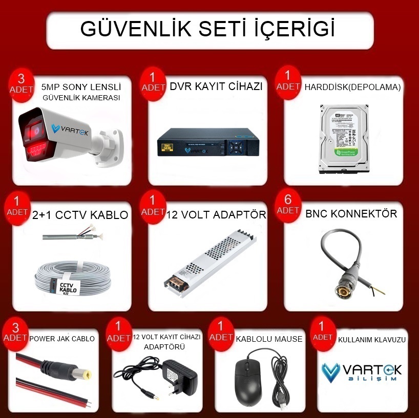 3 Kameralı Gece Görüşlü 5MP Sony Lensli AHD Güvenlik Kamerası Seti