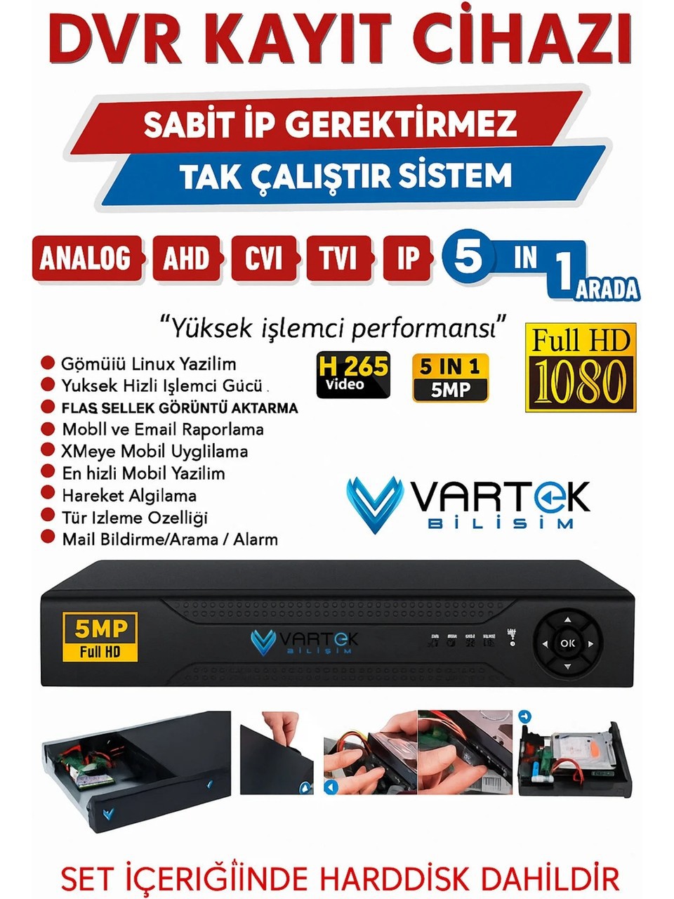 Hikvision 3 Kameralı 2MP 1080P Gece Renkli Güvenlik Kamera Seti Ev, iş yeri, depo, mağaza ve ofis güvenliği için geliştirilmiş Hikvision 3 Kameralı Güvenlik Kamera Seti, yüksek görüntü kalitesi ve kolay kurulumu ile güvenliğinizi maksimum seviyeye çıkarır.; 2MP 1080P Full HD çözünürlük sayesinde tüm detayları net şekilde izleyebilir, gelişmiş gece renkli görüntü teknolojisi ile karanlıkta bile renkli kayıt alabilirsiniz.; Tak çalıştır sistem yapısı sayesinde karmaşık kurulumlara gerek kalmadan hızlı şekilde kullanıma hazır hale gelir.; Set içerisinde bulunan 250 GB HDD kayıt sistemi, görüntülerinizi sürekli olarak kayıt altına alır ve gerektiğinde kolayca izleyebilmenizi sağlar.; Mobil uygulama desteği sayesinde telefon, tablet veya bilgisayar üzerinden uzaktan canlı izleme ve kayıtları görüntüleme imkanı sunar.;  Ürün Özellikleri  3 Adet Hikvision güvenlik kamerası  2MP 1080P Full HD görüntü kalitesi  Gece renkli görüntü teknolojisi  250 GB HDD kayıt sistemi  Tak çalıştır kolay kurulum  7/24 kesintisiz kayıt  Uzaktan izleme (telefon / tablet / PC)  İç ve dış mekan kullanımı  Hareket algılama desteği  Yüksek kaliteli gece görüş performansı  Paket İçeriği 3 Adet Hikvision Güvenlik Kamerası 1 Adet DVR Kayıt Cihazı 250GB HDD Kamera kabloları Adaptör Kurulum için gerekli bağlantı ekipmanları  Kullanım Alanları  Ev güvenliği  İş yeri ve ofis  Market ve mağaza  Depo ve fabrika  Apartman girişleri  Bahçe ve dış mekan güvenliği SEO Anahtar Kelimeler: Hikvision kamera seti güvenlik kamera seti 3 kameralı güvenlik sistemi 1080p güvenlik kamerası 2mp kamera seti gece renkli kamera full hd güvenlik kamera sistemi tak çalıştır kamera sistemi dvr kayıt cihazlı kamera seti ev güvenlik kamera sistemi işyeri güvenlik kamera seti uzaktan izleme kamera sistemi hdd kayıtlı kamera seti hikvision güvenlik sistemi
