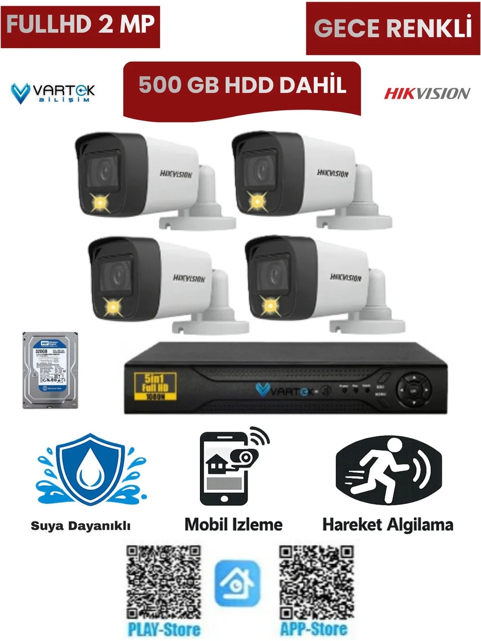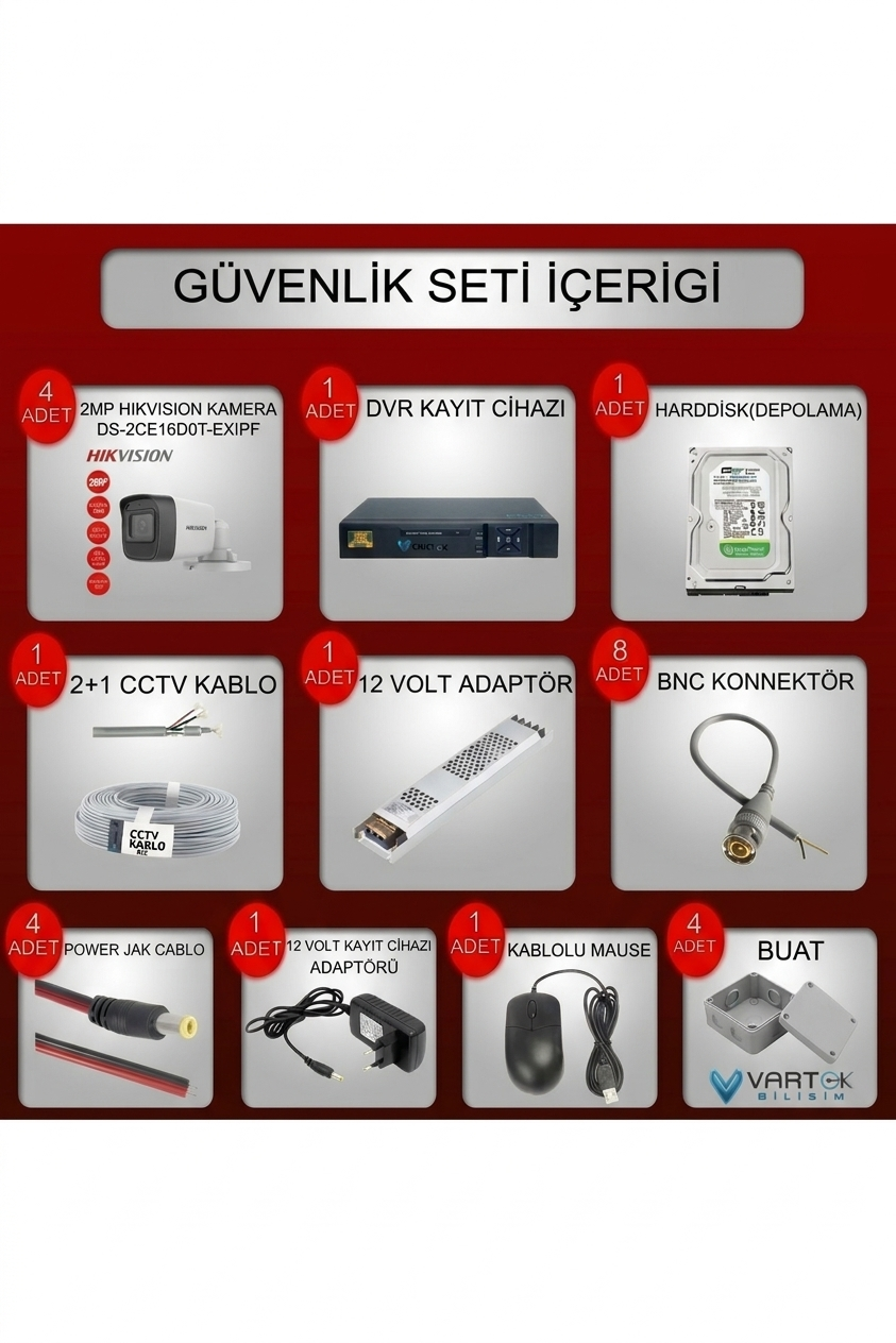 Hikvision 4 Kameralı 2MP 1080P Gece Renkli Güvenlik Kamera Seti Ev, iş yeri, depo, mağaza ve ofis güvenliği için geliştirilmiş Hikvision 4 Kameralı Güvenlik Kamera Seti, yüksek görüntü kalitesi ve kolay kurulumu ile güvenliğinizi maksimum seviyeye çıkarır.; 2MP 1080P Full HD çözünürlük sayesinde tüm detayları net şekilde izleyebilir, gelişmiş gece renkli görüntü teknolojisi ile karanlıkta bile renkli kayıt alabilirsiniz.; Tak çalıştır sistem yapısı sayesinde karmaşık kurulumlara gerek kalmadan hızlı şekilde kullanıma hazır hale gelir.; Set içerisinde bulunan 250 GB HDD kayıt sistemi, görüntülerinizi sürekli olarak kayıt altına alır ve gerektiğinde kolayca izleyebilmenizi sağlar.; Mobil uygulama desteği sayesinde telefon, tablet veya bilgisayar üzerinden uzaktan canlı izleme ve kayıtları görüntüleme imkanı sunar.; Ürün Özellikleri 4 Adet Hikvision güvenlik kamerası 2MP 1080P Full HD görüntü kalitesi Gece renkli görüntü teknolojisi 250 GB HDD kayıt sistemi Tak çalıştır kolay kurulum 7/24 kesintisiz kayıt Uzaktan izleme (telefon / tablet / PC) İç ve dış mekan kullanımı Hareket algılama desteği Yüksek kaliteli gece görüş performansı Paket İçeriği 4 Adet Hikvision Güvenlik Kamerası 1 Adet DVR Kayıt Cihazı 250GB HDD Kamera kabloları Adaptör Kurulum için gerekli bağlantı ekipmanları Kullanım Alanları Ev güvenliği İş yeri ve ofis Market ve mağaza Depo ve fabrika Apartman girişleri Bahçe ve dış mekan güvenliği SEO Anahtar Kelimeler: Hikvision kamera seti güvenlik kamera seti 4 kameralı güvenlik sistemi 1080p güvenlik kamerası 2mp kamera seti gece renkli kamera full hd güvenlik kamera sistemi tak çalıştır kamera sistemi dvr kayıt cihazlı kamera seti ev güvenlik kamera sistemi işyeri güvenlik kamera seti uzaktan izleme kamera sistemi hdd kayıtlı kamera seti hikvision güvenlik sistemi