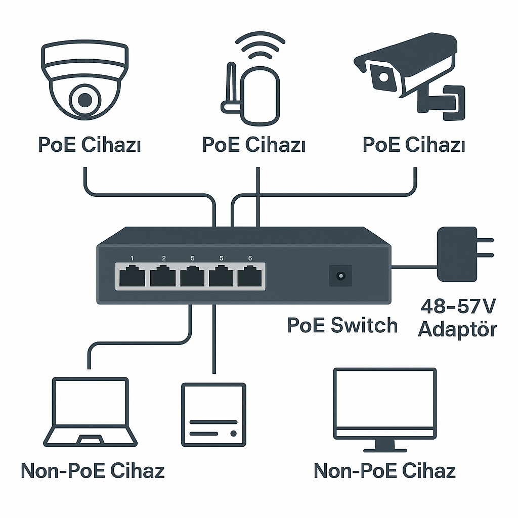 4 PoE port (Kameralar için ek güç kaynağı gerektirmez)