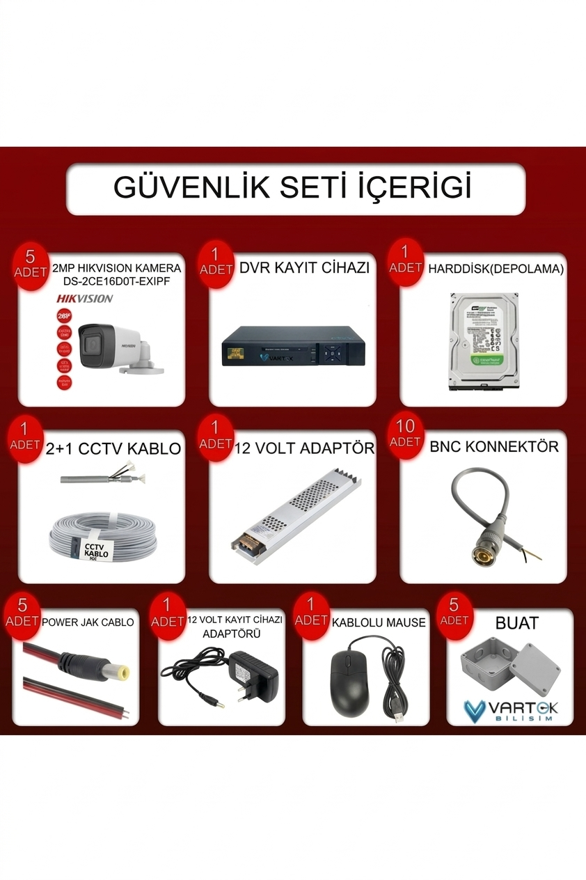 Hikvision 5 Kameralı 2MP 1080P Gece Renkli Güvenlik Kamera Seti Ev, iş yeri, depo, mağaza ve ofis güvenliği için geliştirilmiş Hikvision 5 Kameralı Güvenlik Kamera Seti, yüksek görüntü kalitesi ve kolay kurulumu ile güvenliğinizi maksimum seviyeye çıkarır.; 2MP 1080P Full HD çözünürlük sayesinde tüm detayları net şekilde izleyebilir, gelişmiş gece renkli görüntü teknolojisi ile karanlıkta bile renkli kayıt alabilirsiniz.; Tak çalıştır sistem yapısı sayesinde karmaşık kurulumlara gerek kalmadan hızlı şekilde kullanıma hazır hale gelir.; Set içerisinde bulunan 320 GB HDD kayıt sistemi, görüntülerinizi sürekli olarak kayıt altına alır ve gerektiğinde kolayca izleyebilmenizi sağlar.; Mobil uygulama desteği sayesinde telefon, tablet veya bilgisayar üzerinden uzaktan canlı izleme ve kayıtları görüntüleme imkanı sunar.; Ürün Özellikleri 5 Adet Hikvision güvenlik kamerası 2MP 1080P Full HD görüntü kalitesi Gece renkli görüntü teknolojisi 320 GB HDD kayıt sistemi Tak çalıştır kolay kurulum 7/24 kesintisiz kayıt Uzaktan izleme (telefon / tablet / PC) İç ve dış mekan kullanımı Hareket algılama desteği Yüksek kaliteli gece görüş performansı Paket İçeriği 5 Adet Hikvision Güvenlik Kamerası 1 Adet DVR Kayıt Cihazı 320 GB HDD Kamera kabloları Adaptör Kurulum için gerekli bağlantı ekipmanları Kullanım Alanları Ev güvenliği İş yeri ve ofis Market ve mağaza Depo ve fabrika Apartman girişleri Bahçe ve dış mekan güvenliği SEO Anahtar Kelimeler: Hikvision kamera seti güvenlik kamera seti 5 kameralı güvenlik sistemi 1080p güvenlik kamerası 2mp kamera seti gece renkli kamera full hd güvenlik kamera sistemi tak çalıştır kamera sistemi dvr kayıt cihazlı kamera seti ev güvenlik kamera sistemi işyeri güvenlik kamera seti uzaktan izleme kamera sistemi hdd kayıtlı kamera seti hikvision güvenlik sistemi