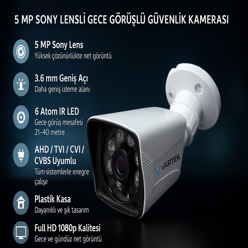 Bu güvenlik kamerası, hem iç hem de dış mekân kullanımına uygun dayanıklı yapısı ve güçlü gece görüş performansı ile 7/24 net görüntü sunar. 5 MP Sony lensi sayesinde yüksek çözünürlükte detaylı görüntü alabilir, 3.6 mm geniş açı lens ile daha geniş alanları rahatlıkla izleyebilirsiniz. 6 adet IR LED yapısı karanlık ortamlarda etkili gece görüşü sağlar.