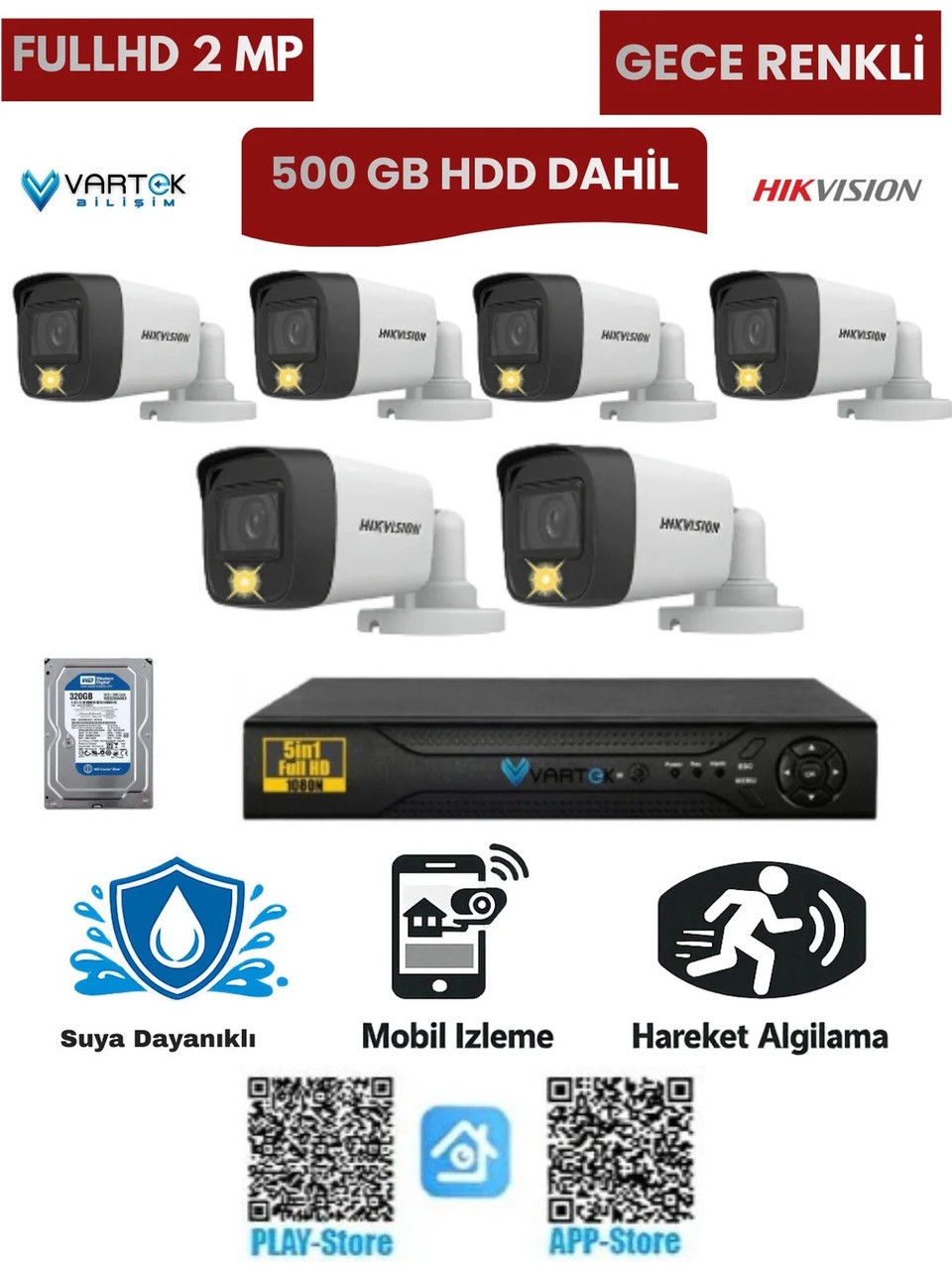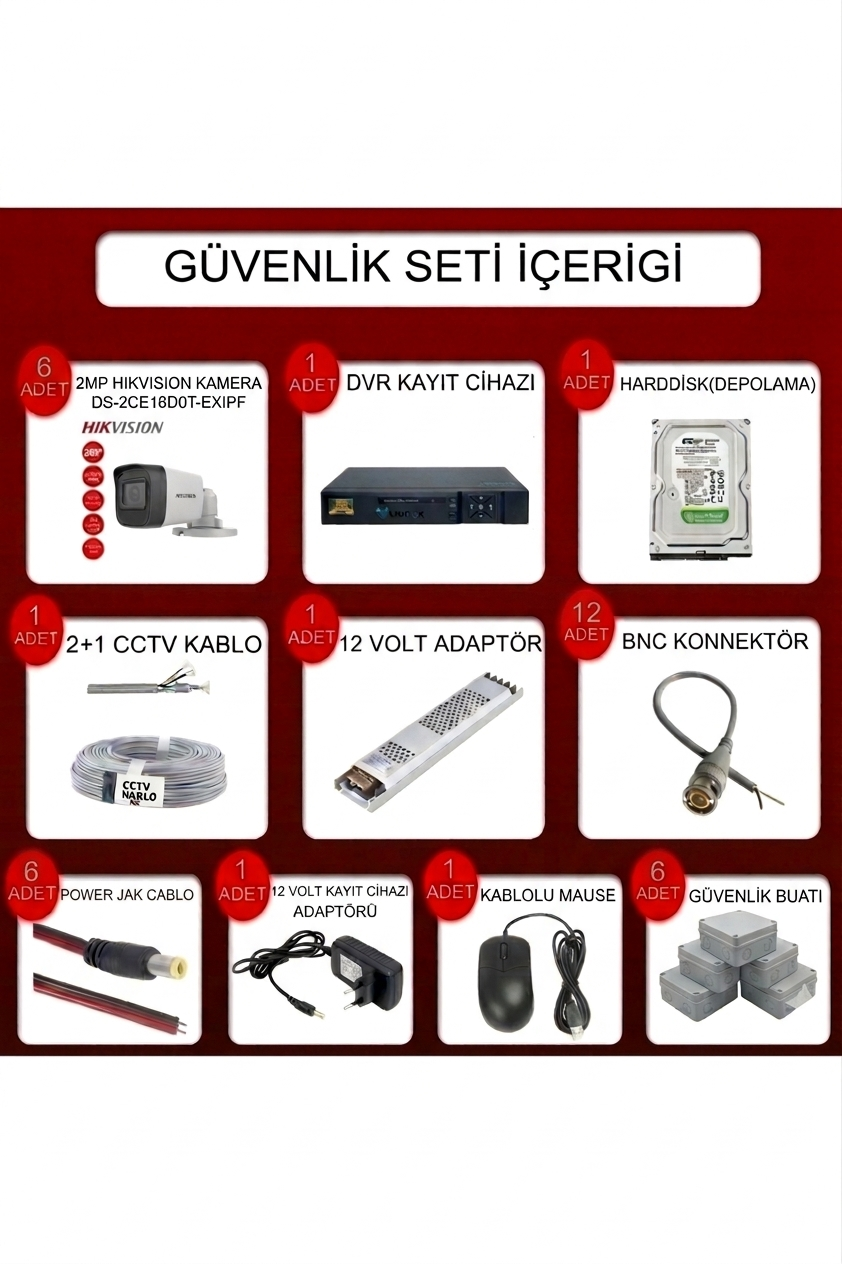 Hikvision 6 Kameralı 2MP 1080P Gece Renkli Güvenlik Kamera Seti Ev, iş yeri, depo, mağaza ve ofis güvenliği için geliştirilmiş Hikvision 6 Kameralı Güvenlik Kamera Seti, yüksek görüntü kalitesi ve kolay kurulumu ile güvenliğinizi maksimum seviyeye çıkarır.; 2MP 1080P Full HD çözünürlük sayesinde tüm detayları net şekilde izleyebilir, gelişmiş gece renkli görüntü teknolojisi ile karanlıkta bile renkli kayıt alabilirsiniz.; Tak çalıştır sistem yapısı sayesinde karmaşık kurulumlara gerek kalmadan hızlı şekilde kullanıma hazır hale gelir.; Set içerisinde bulunan 320 GB HDD kayıt sistemi, görüntülerinizi sürekli olarak kayıt altına alır ve gerektiğinde kolayca izleyebilmenizi sağlar.; Mobil uygulama desteği sayesinde telefon, tablet veya bilgisayar üzerinden uzaktan canlı izleme ve kayıtları görüntüleme imkanı sunar.;  Ürün Özellikleri  6 Adet Hikvision güvenlik kamerası  2MP 1080P Full HD görüntü kalitesi  Gece renkli görüntü teknolojisi  320 GB HDD kayıt sistemi  Tak çalıştır kolay kurulum  7/24 kesintisiz kayıt  Uzaktan izleme (telefon / tablet / PC)  İç ve dış mekan kullanımı  Hareket algılama desteği  Yüksek kaliteli gece görüş performansı  Paket İçeriği 6 Adet Hikvision Güvenlik Kamerası 1 Adet DVR Kayıt Cihazı 320 GB HDD Kamera kabloları Adaptör Kurulum için gerekli bağlantı ekipmanları  Kullanım Alanları  Ev güvenliği  İş yeri ve ofis  Market ve mağaza  Depo ve fabrika  Apartman girişleri  Bahçe ve dış mekan güvenliği SEO Anahtar Kelimeler: Hikvision kamera seti güvenlik kamera seti 6 kameralı güvenlik sistemi 1080p güvenlik kamerası 2mp kamera seti gece renkli kamera full hd güvenlik kamera sistemi tak çalıştır kamera sistemi dvr kayıt cihazlı kamera seti ev güvenlik kamera sistemi işyeri güvenlik kamera seti uzaktan izleme kamera sistemi hdd kayıtlı kamera seti hikvision güvenlik sistemi