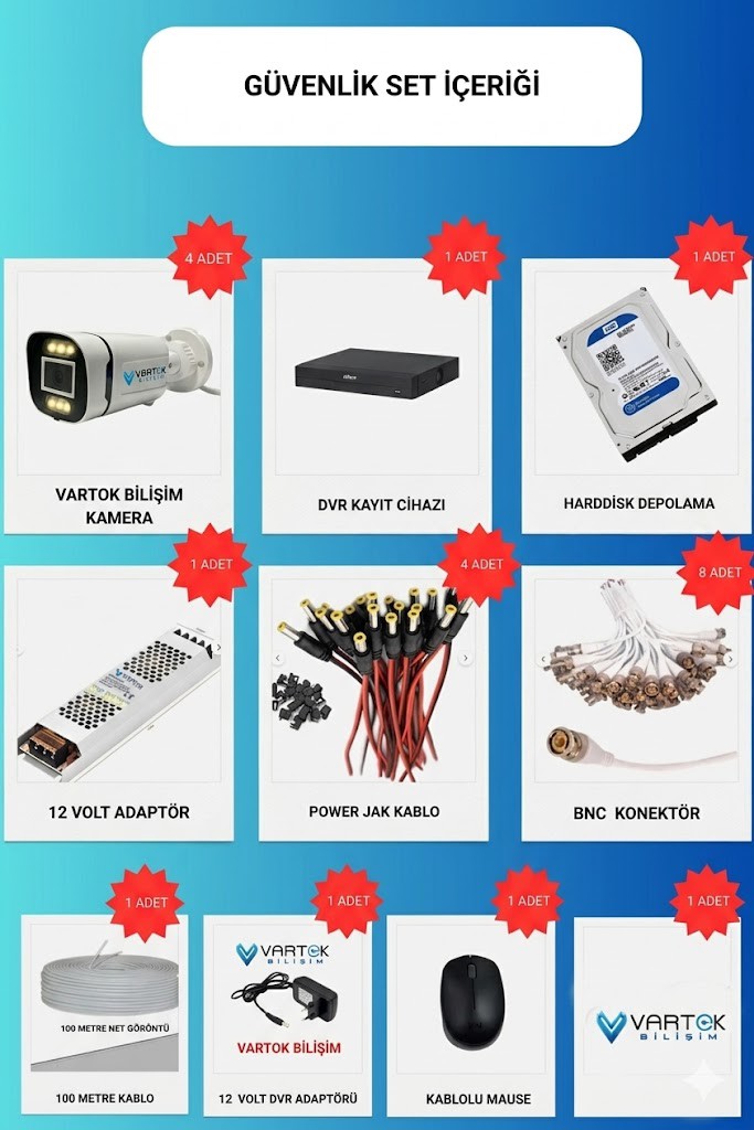 Ev, iş yeri, ofis ve depo güvenliği için hazırlanmış bu tam set güvenlik kamera sistemi, ekstra ekipmana ihtiyaç duymadan kuruluma hazır şekilde gönderilir. Tak çalıştır mantığı ile kolayca kurulabilir ve anında kullanıma başlanabilir.